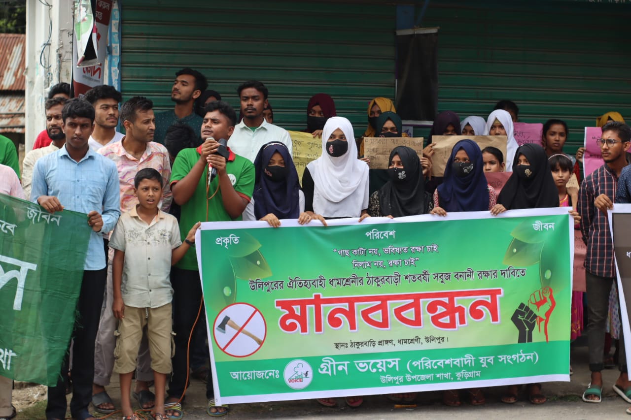 কুড়িগ্রামের উলিপুর উপজেলার ধামশ্রেণী ইউনিয়নে শতবর্ষী গাছ কাটা ও নিলামের সিদ্ধান্তের বিরুদ্ধে মানববন্ধন করেছে পরিবেশবাদী যুব সংগঠন গ্রীন ভয়েস।