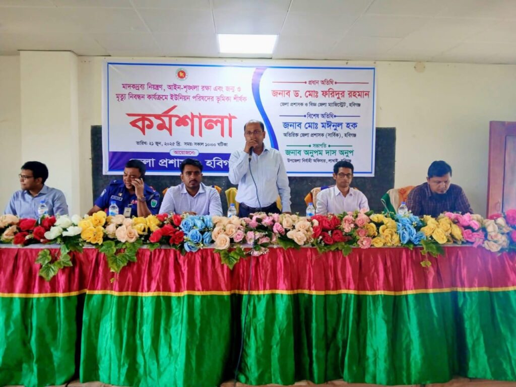 এম এ ওয়াহেদ লাখাই , হবিগঞ্জ জেলা পরিষদের আয়োজনে ও উপজেলা পরিষদের বাস্তবায়নে গতকাল শনিবার সকলা ১০টায় উপজেলা নির্বাহী কর্মকর্তা অনুপম দাস অনুপের সভাপতিত্বে উপজেলা অডিটোরিয়ামে হলে মাদক নিয়ন্ত্রণ, আইন শৃঙ্খলা রক্ষা এবং জন্ম ও মৃত্যু নিবন্ধনে ইউনিয়ন পরিষদের ভুমিকা শীর্ষক এক কর্মশালা অনুষ্ঠিত হয়েছে। কর্মশালায় প্রধান অতিথি হিসেবে উপস্থিত ছিলেন জেলা প্রশাসক ড.মোঃ ফরিদুর রহমান, বিশেষ অতিথি হিসেবে উপস্থিত ছিলেন অতিরিক্ত জেলা প্রশাসক (সার্বিক) মোঃ মঈনুল হক। আরো উপস্থিত ছিলেন উপজেলা স্বাস্থ্য ও পঃ পঃ কর্মকর্তা ডা. কাজী শামসুল আরেফীন, উপজেলা পঃ পঃ কর্মকর্তা নাঈমুর রহমান, ভারপ্রাপ্ত কর্মকর্তা মোঃ বন্দে আলী, লাখাই ইউনিয়ন পরিষদের চেয়ারম্যান আলহাজ্ব আরিফ আহমেদ রুপন, বামৈ ইউনিয়ন পরিষদের চেয়ারম্যান হাজী আজাদ হোসেন ফুরুক, ৬ ইউনিয়ন পরিষদের সচিব, ৬ ,ইউনিয়ন পরিষদের অফিস সহকারী ও উপজেলার গ্রাম পুলিশ প্রমুখ। কর্মশালায় প্রধান অতিথি জেলা প্রশাসক ড.মোঃ ফরিদুর রহমান সংশ্লিষ্ট সকলের উদ্দেশ্য বলেন যার যার অবস্থান থেকে যদি আমরা মাদক নিয়ন্ত্রণ, আইনশৃঙ্খলা রক্ষা, এবং জন্ম ও মৃত্যু নিবন্ধনে সক্রিয় ভাবে কাজ করতে পারি তা হলে মাদক নিয়ন্ত্রণ, দাঙ্গা প্রতিরোধ, ও জন্ম ও মৃত্যু নিবন্ধন বহুলাংশে কমিয়ে আনা সম্ভব। এতে জনগণ স্থানীয় প্রশাসন, পুলিশ প্রশাসন ও স্থানীয় ইউনিয়ন পরিষদে সেবা নিতে আসা জনগণ উপকৃত হবে। এবং মাদক নিয়ন্ত্রণে সকলের ঐক্য বদ্ধ প্রয়াশ চালাতে হবে এবং জনপ্রতিনিধিদের এ ব্যপারে সক্রিয় ভুমিকা রাখতে পারলে সমাজ থেকে মাদকের ভয়াবহ অবস্থা থেকে যুব সমাজ কে রক্ষা করা সম্ভব বলে আমি মনে করি।